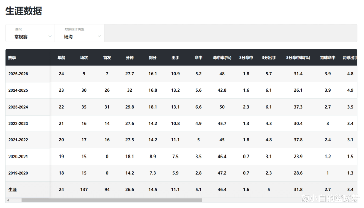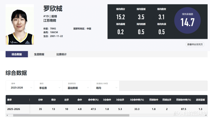 今年25岁的罗欣棫已经在WCBA打了7个赛季,场均26.6分钟,拿到14.5分5.2篮板2.6助攻1.1抢断0.4盖帽,命中率46.4%,三分命中率31.8%。罗欣棫已经算是联赛的顶级3D锋线了。